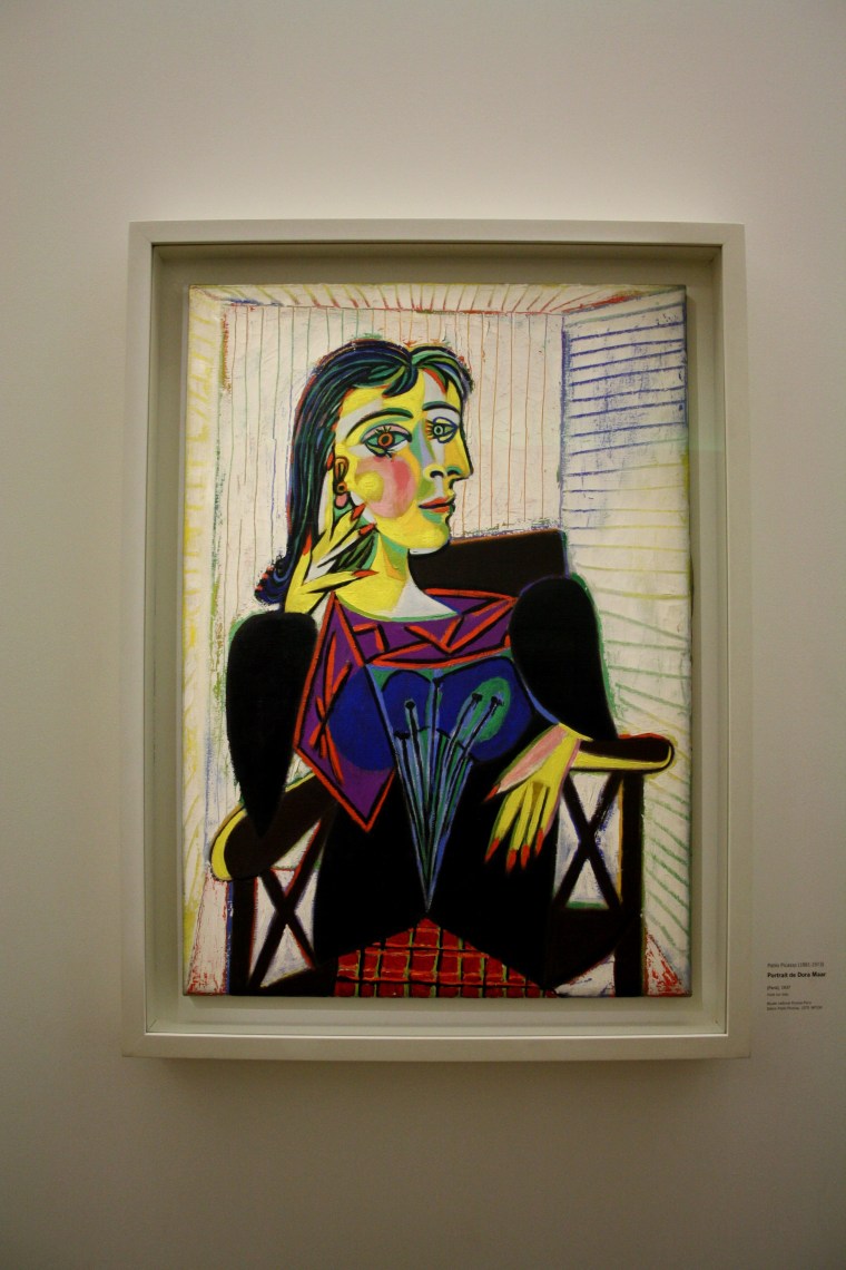 On peut considérer Picasso comme étant un inventeur et un testeur. Il cherchait sans cesse de nouveaux moyens d’expression. Peut-être une manière de se trouver lui-même, de trouver SON style, sa marque. D’ailleurs dans la salle juste à côté de l’oeuvre précédente hyper réaliste se trouve un chef-d’oeuvre incontestable : Les Demoiselles d’Avignon. Actuellement au Museum of Modern Art de New York depuis 1939, la toile ne voyage plus. Tout de même, le musée nous propose une reproduction signée Jacqueline de La Baume-Durrbach et validée par Picasso lui même : « Tellement mieux que la première ».