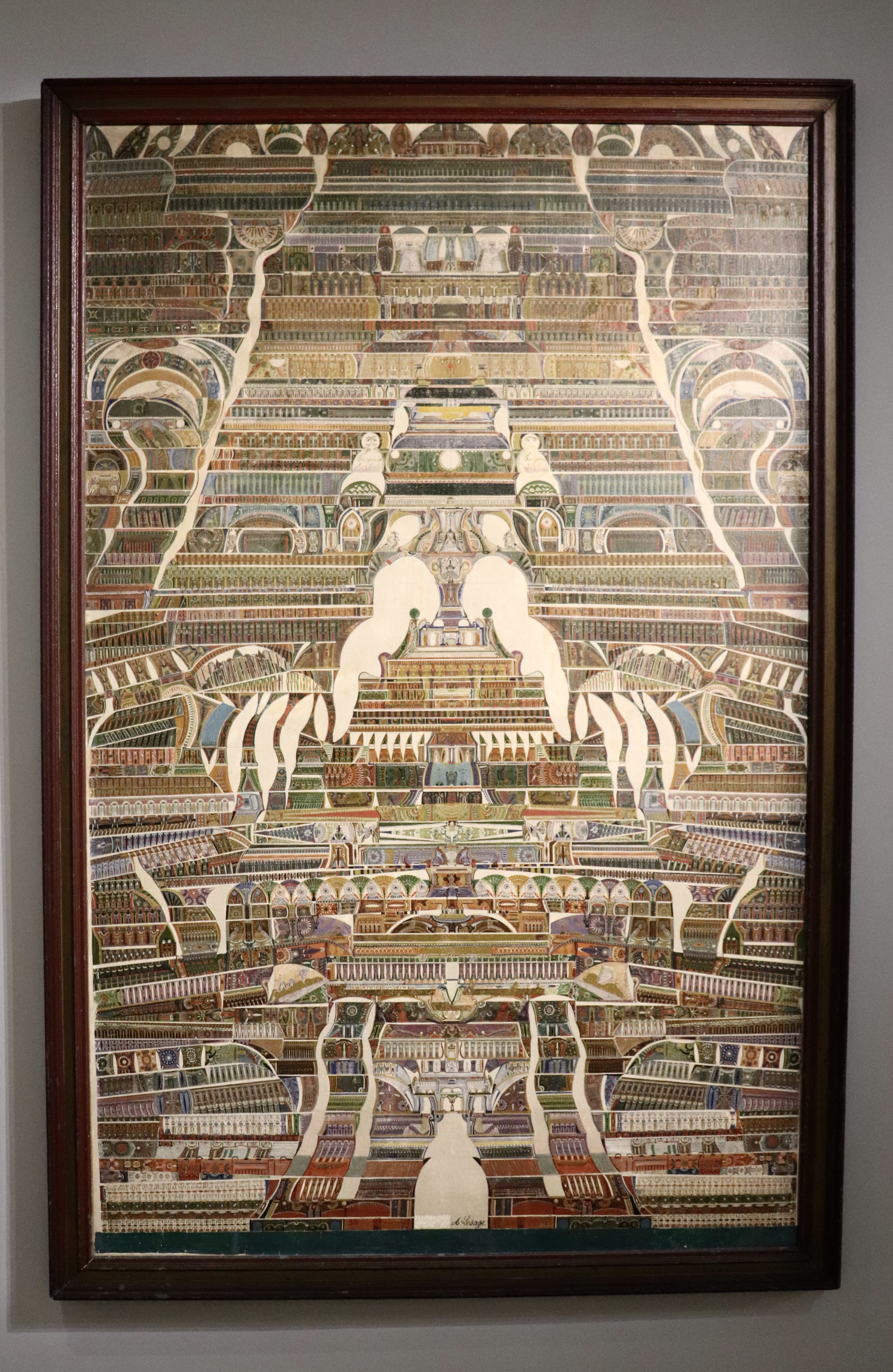 Il y a vraiment quelque chose d’étonnant tout de même chez Augustin Lesage. Déjà comme je le disais il n’avait aucune préposition pour l’art en général. De plus, il ne faisait jamais de brouillons ou d’essais pour ses œuvres ce qui est assez fou lorsque l’on voit le détail de ses œuvres. Il était assez stoïque face à ses créations et c’est comme s’il avait le syndrome de l’imposteur. Il disait souvent que ce n’était pas ses œuvres. Plusieurs d’entre elles sont signées « Marie ». C’était le nom de sa petite sœur décédée. Il disait aussi être en contact avec Léonard de Vinci et pensait sérieusement être là réincarnation d’un artiste ayant vécu dans l’Égypte Antique. En 1927, il expose ses œuvres à l’Institut Métaphysique de Paris où il étonne tout le monde.