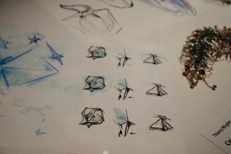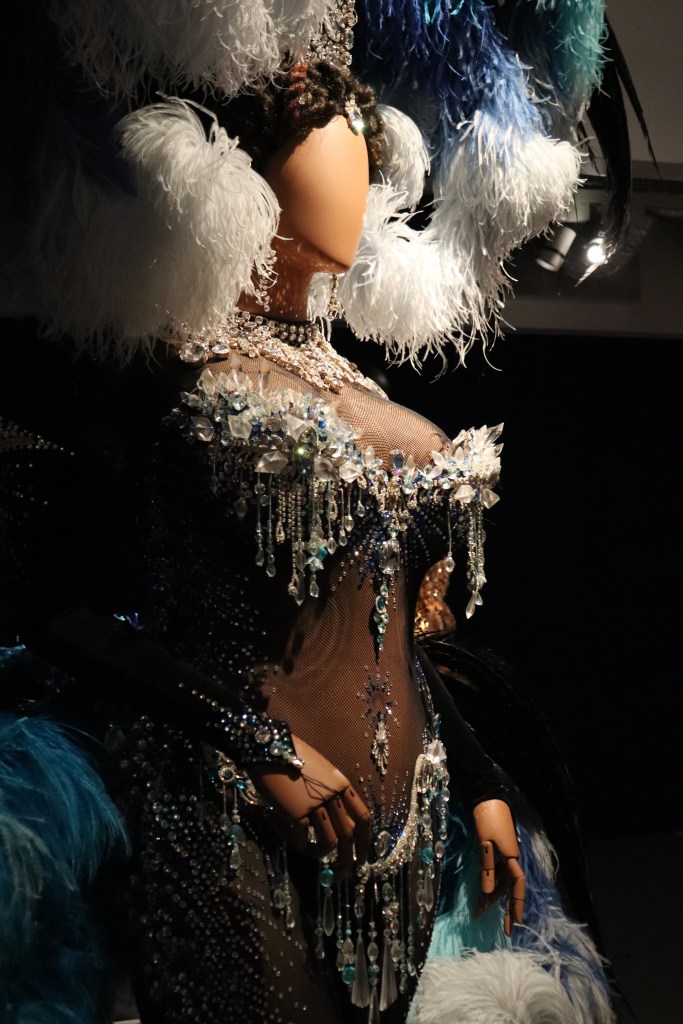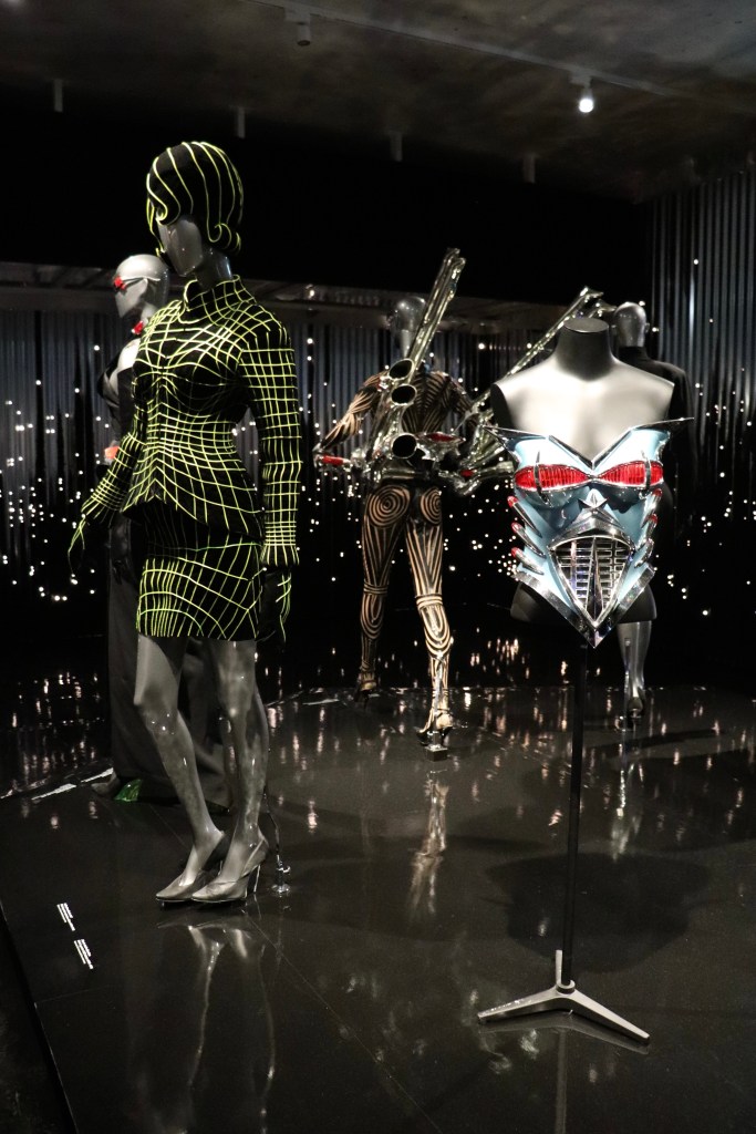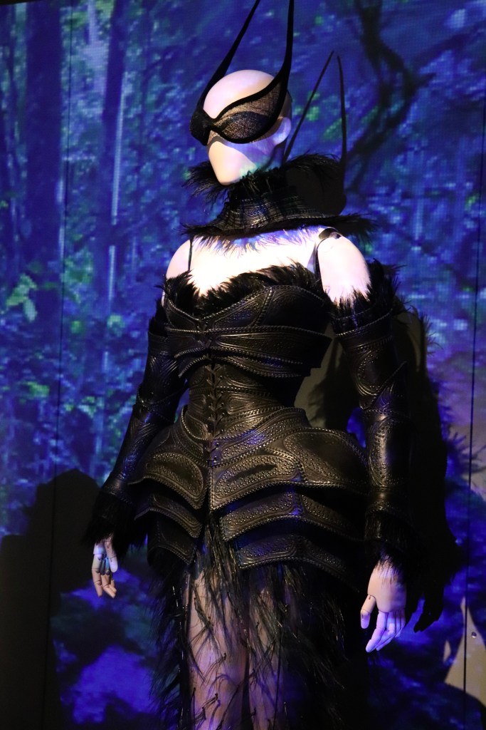 L’exposition est thématisée et revient sur toutes les grandes inspirations de l’artiste. Commençons donc par son bestiaire. Mugler est fasciné par les insectes et s’en inspire pour créer des silhouettes incroyables ! Certaines ont des allures de superhéroïnes, d’autres de femmes fatales. Des projections sont faites sur les murs pour nous donner l’impression d’être littéralement happés dans cet univers. De la musique, des bruits d’insectes… C’est une immersion totale.