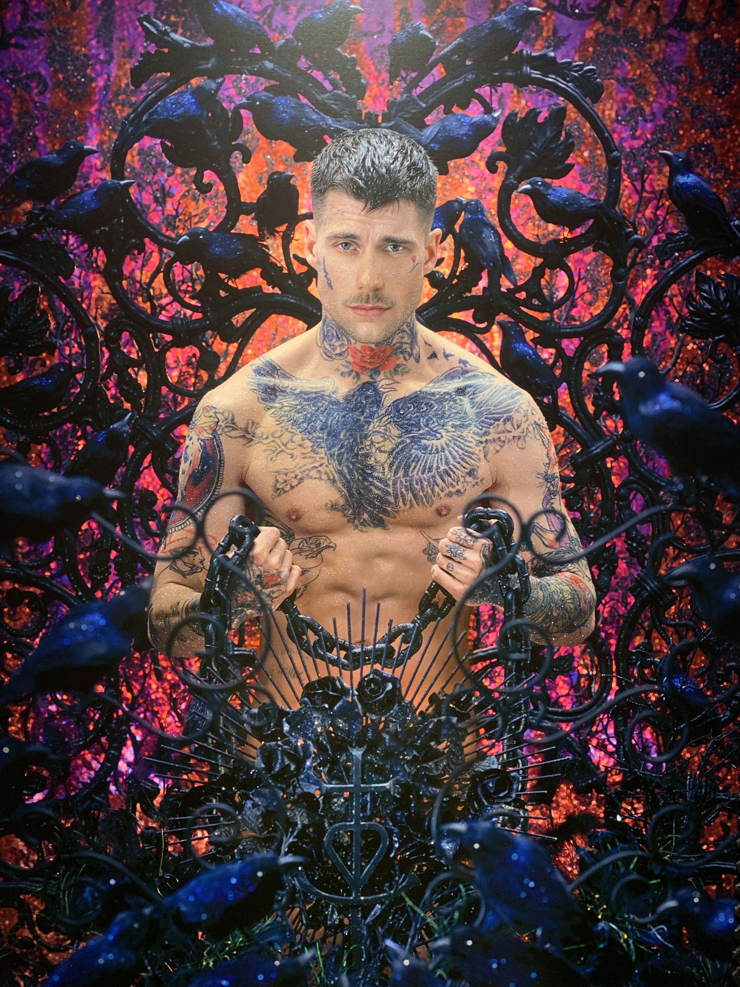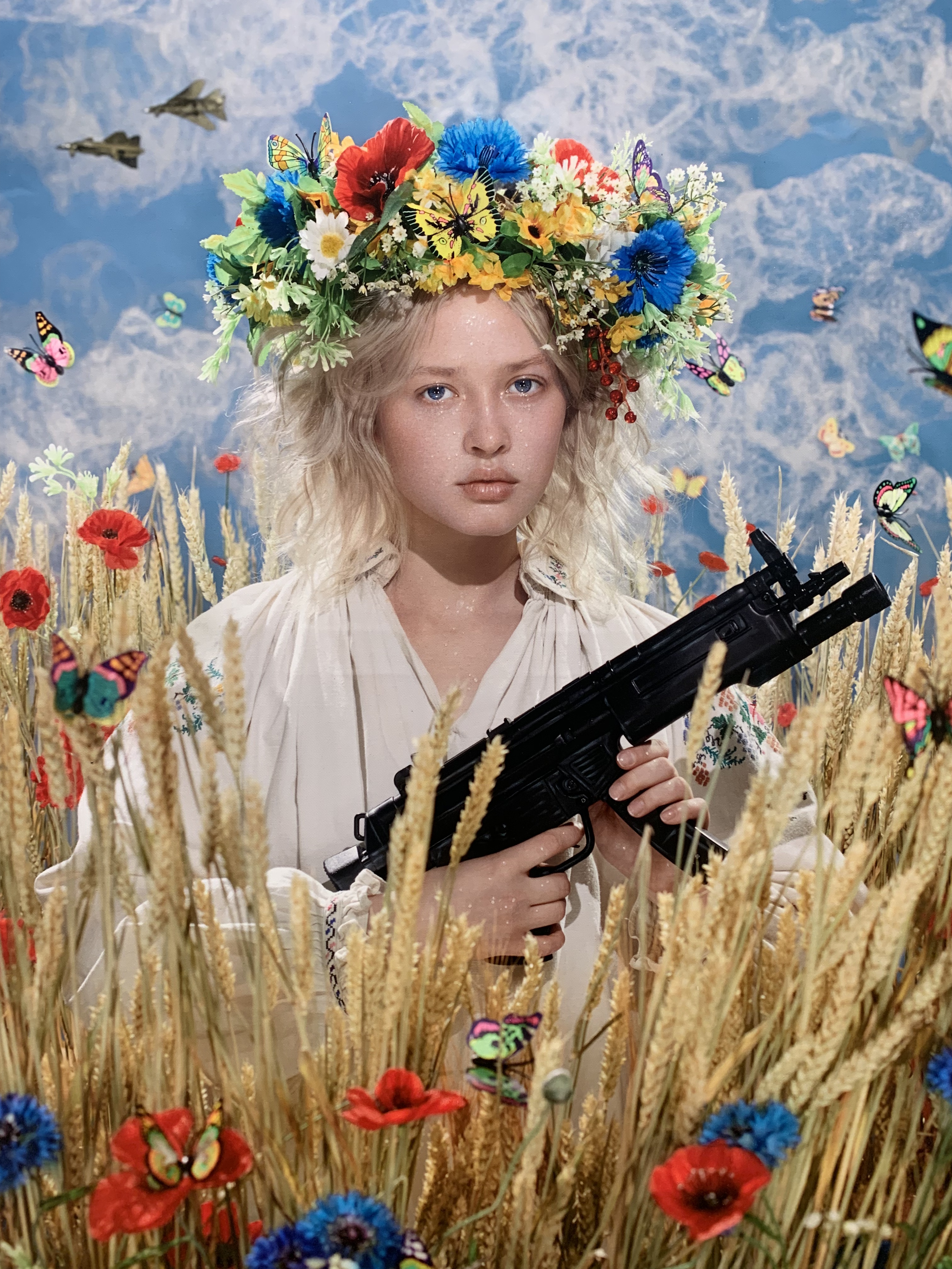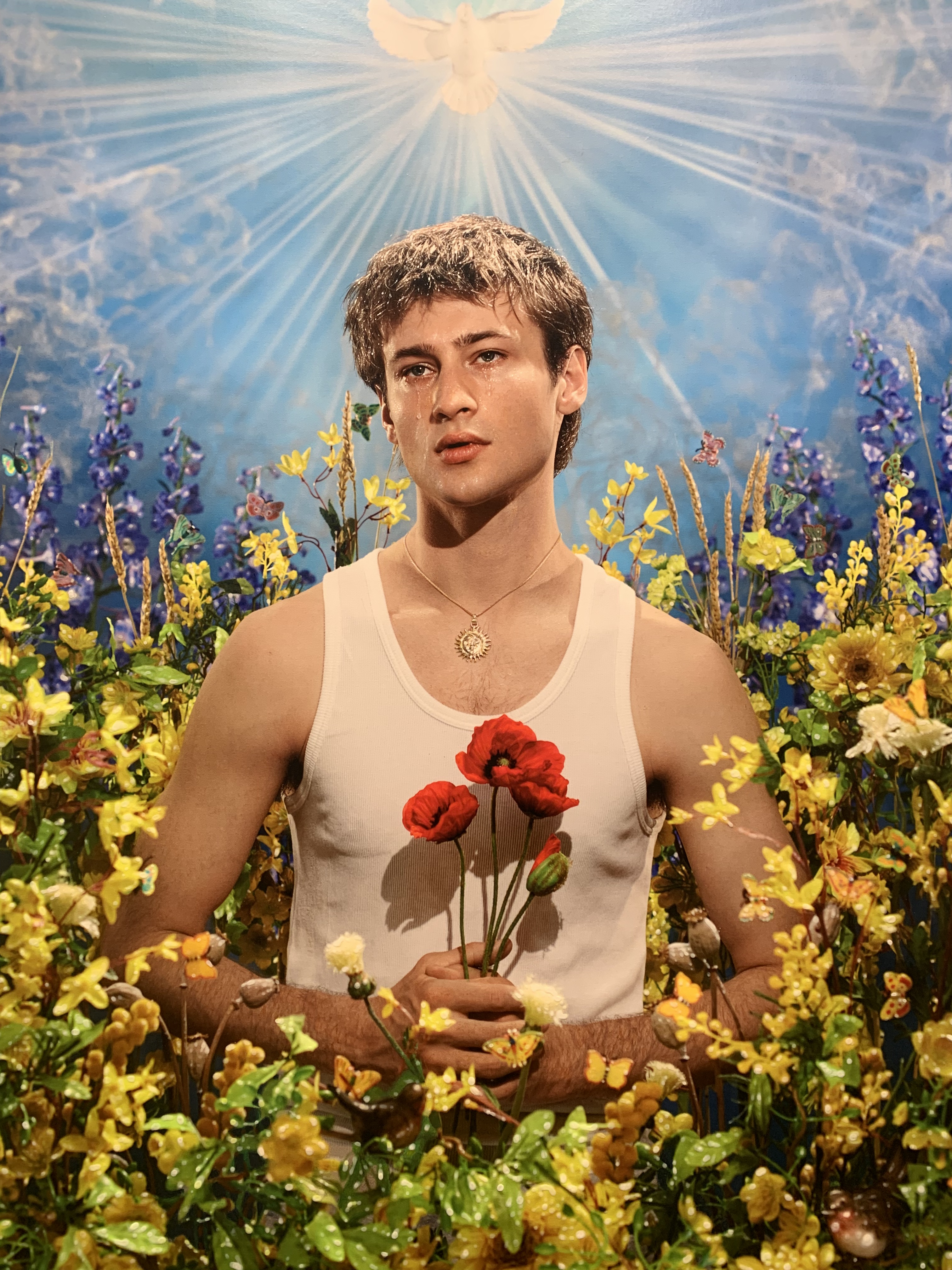 Artistes réputés à l’international, ils exposent très souvent leur travail à travers le globe et en cette fin d’année, on les retrouve donc à la Galerie Templon. Le duo y expose des œuvres inédites réalisées lors de ces trois dernières années. Pour inspiration, ils puisent dans l’actualité, dans la société dans laquelle nous vivons. Forcément, la guerre en Ukraine est un sujet que l’on retrouve directement puisque nous sommes accueillis par deux portraits de jeunes ukrainiens prenant les armes, pleurant la paix et l’innocence perdus. Pierre et Gilles manifestent leur soutien au pays et à cette jeunesse meurtrie en les matérialisant dans leur univers si poétique.