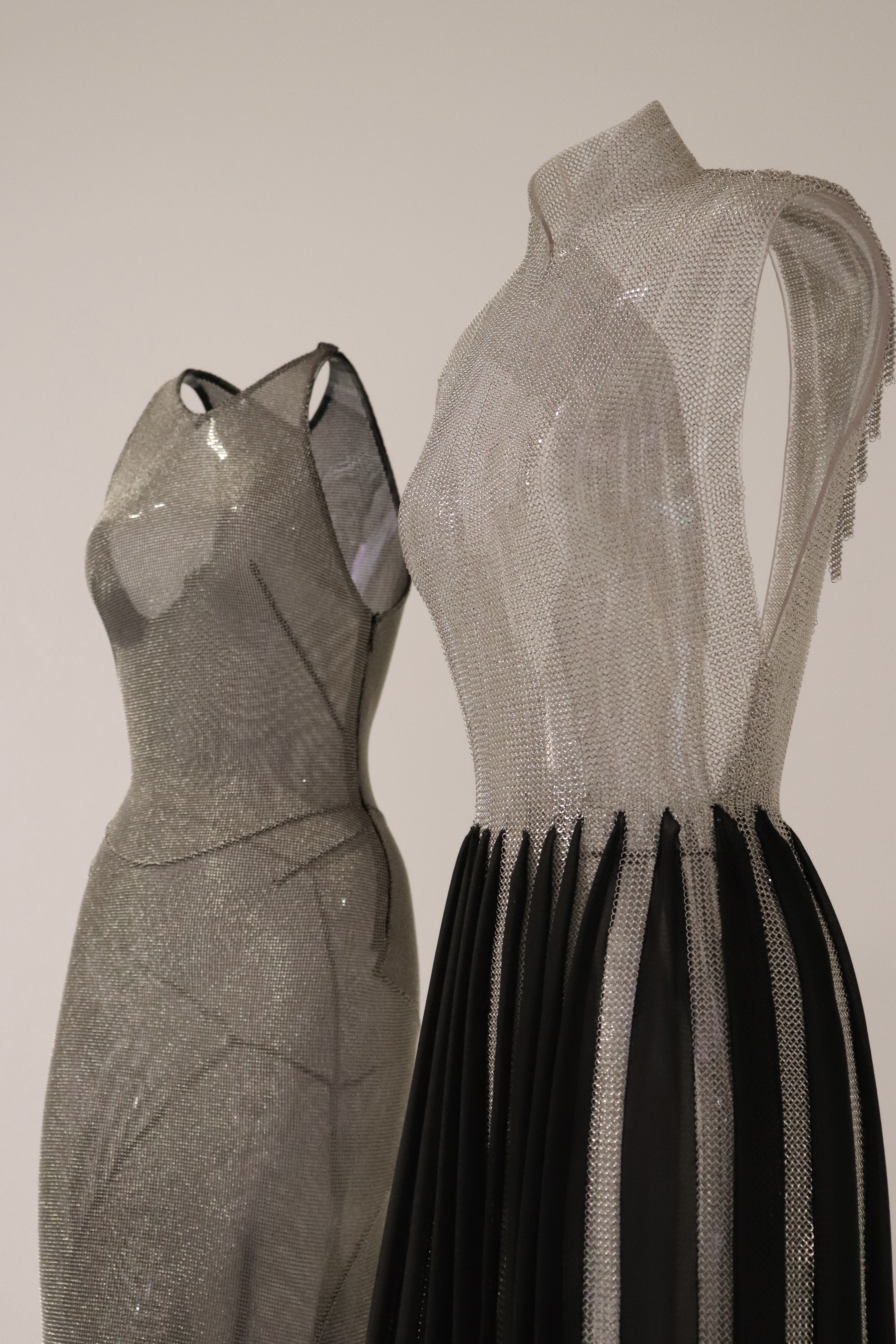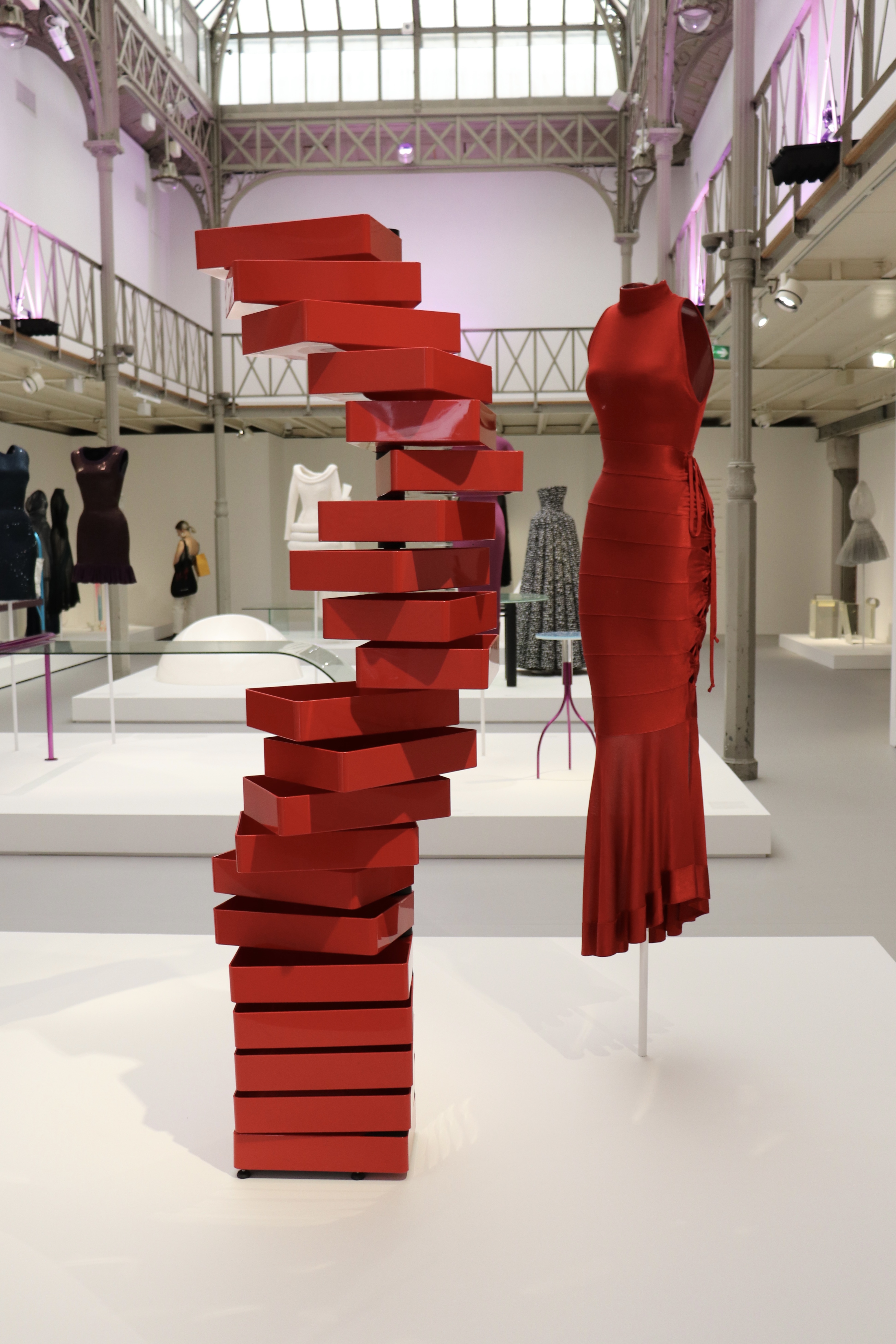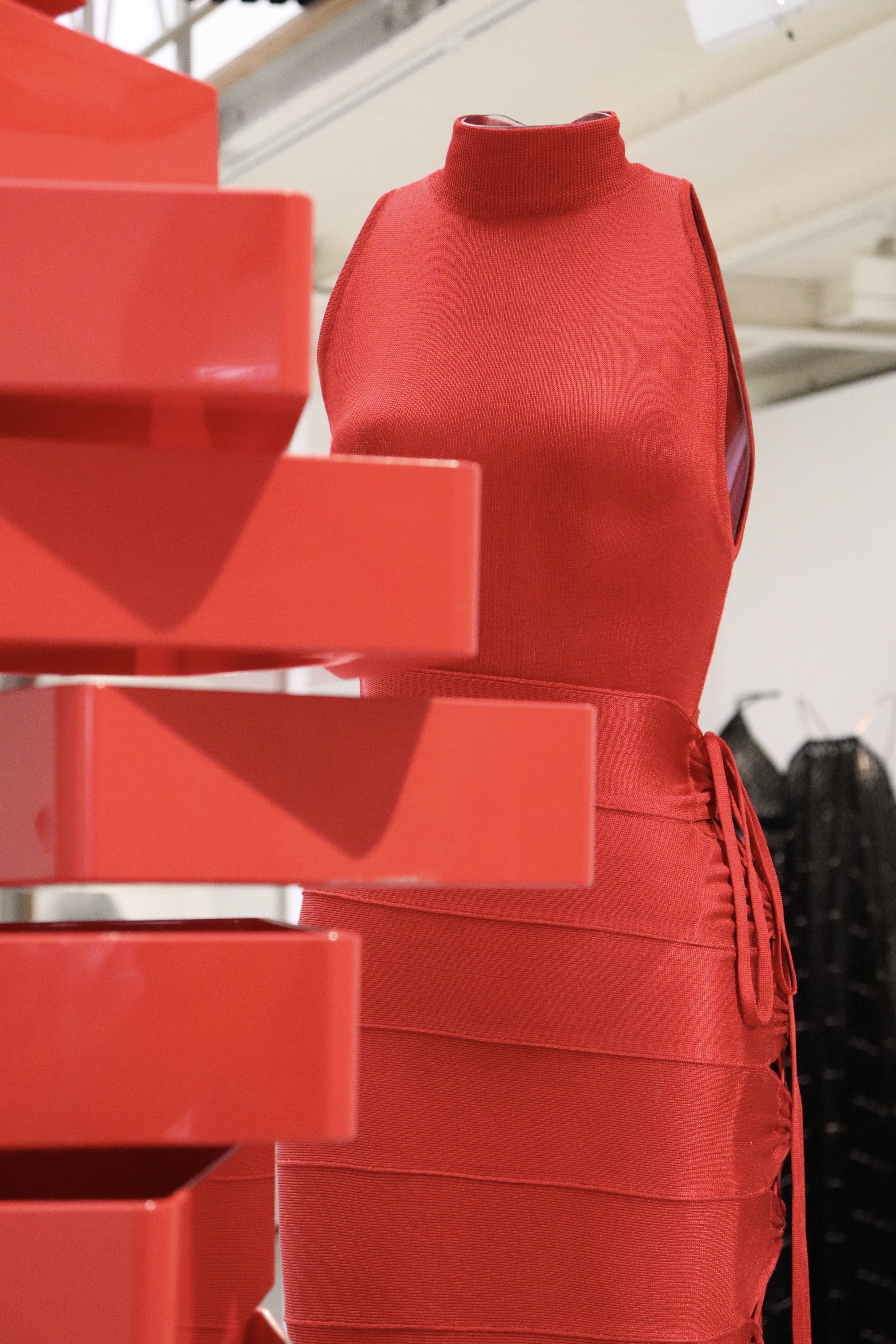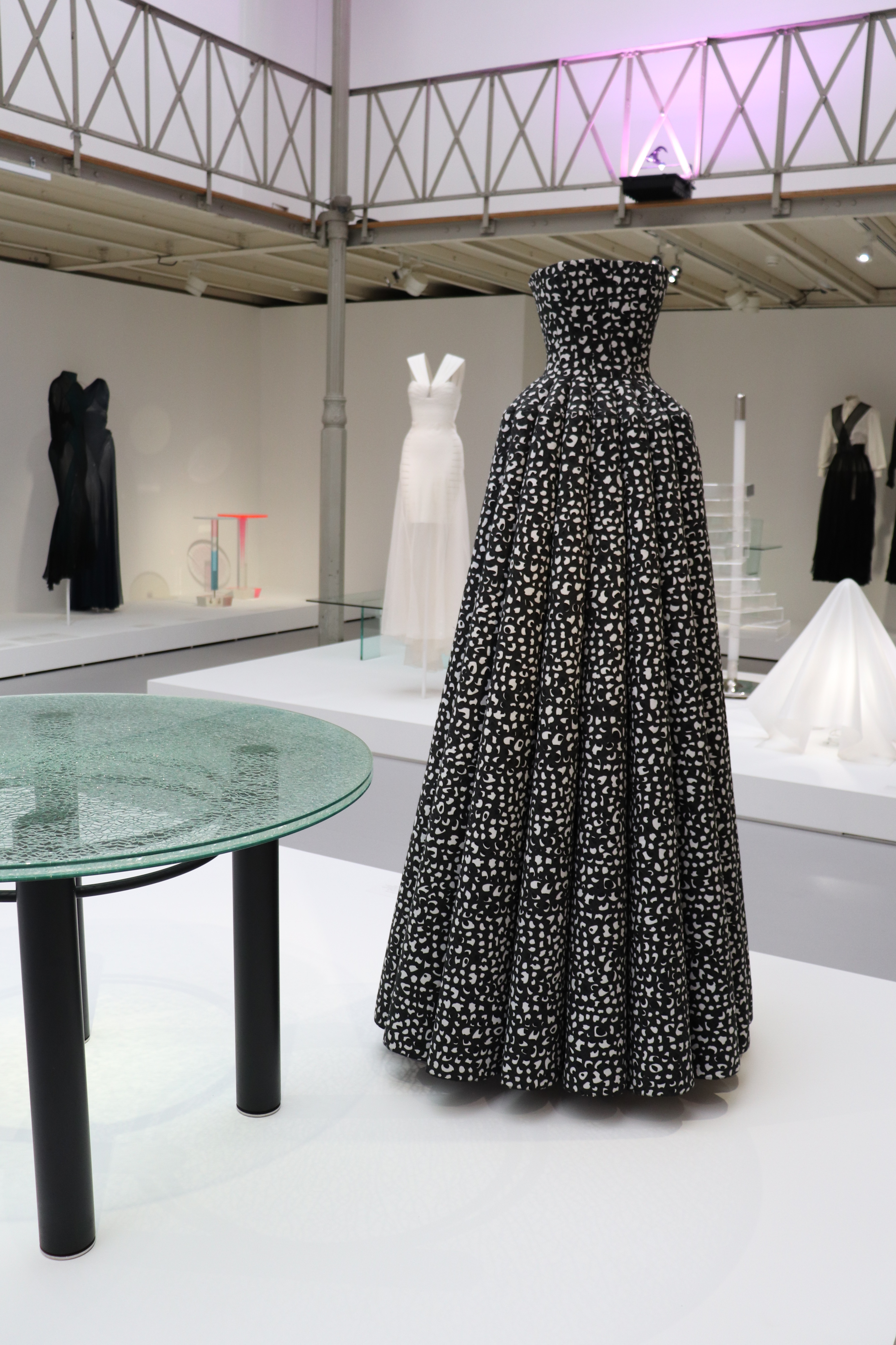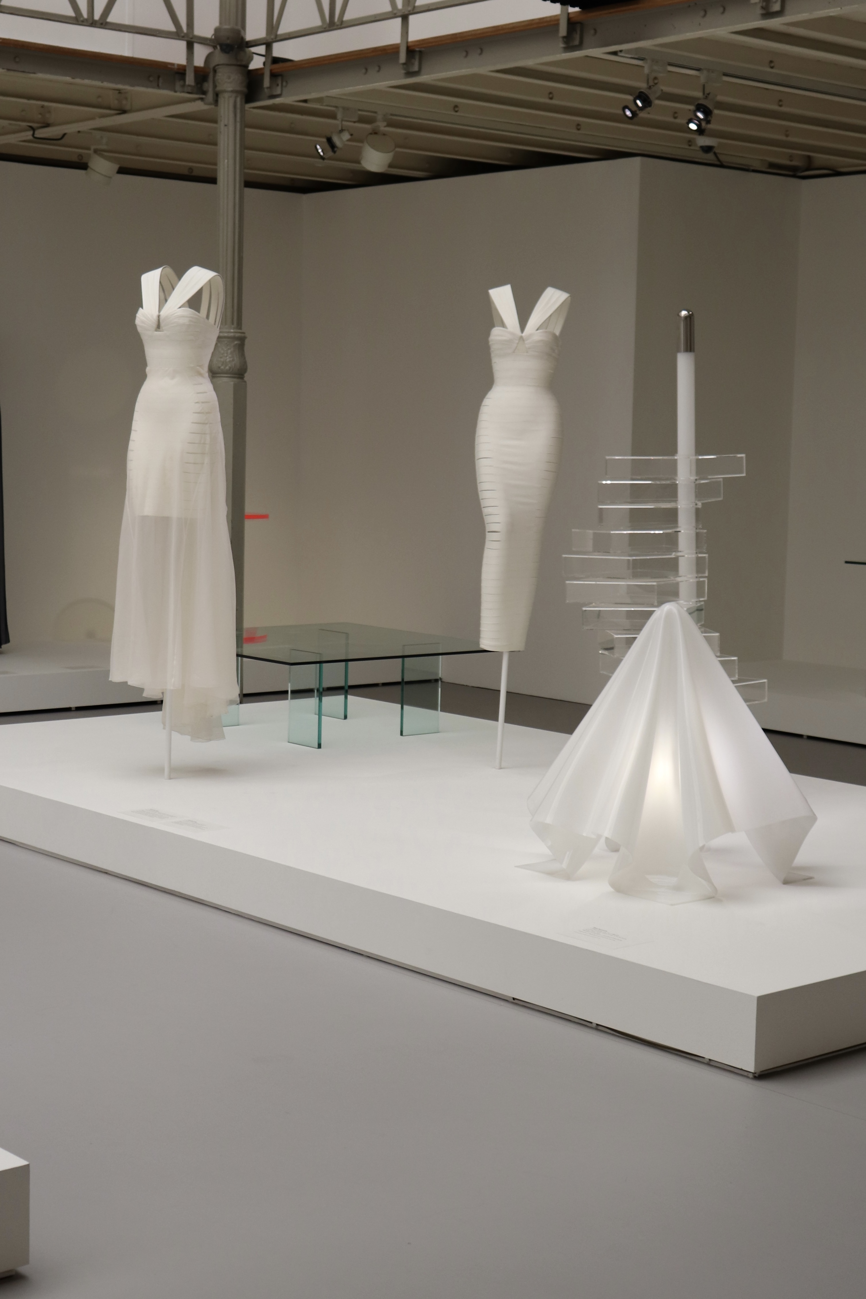 En plus de retrouver les oeuvres de Shiro Kuramata, la Fondation Azzedine Alaia a selectionné très soigneusement plusieurs silhouettes du grand couturier. Celles-ci communiquent parfaitement avec les objets que ce soit par leur couleur ou par leur forme.
