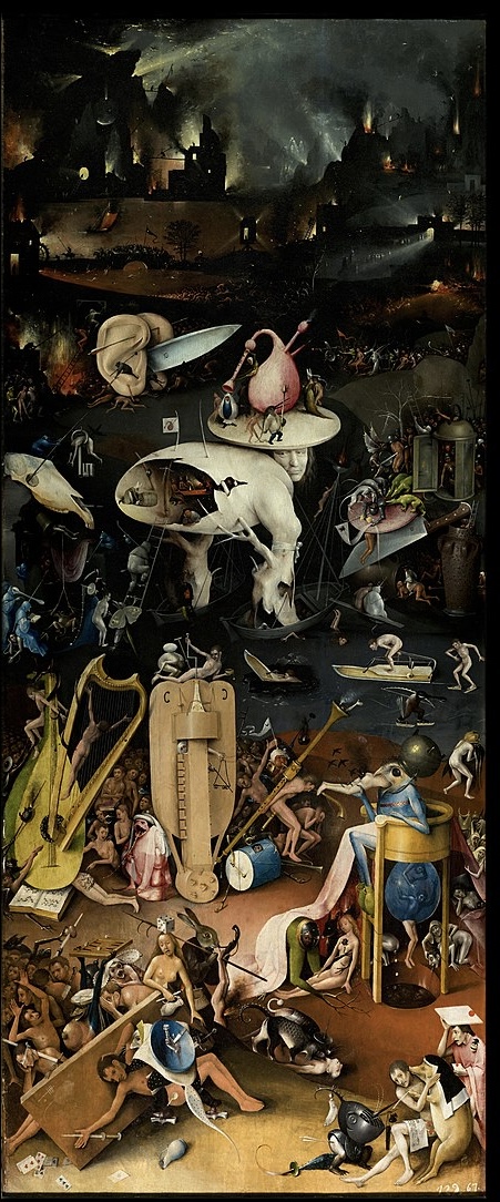 La dernière partie contraste énormément avec les précédentes, elle représente l’Enfer. Les couleurs sont très sombres et la vision donnée est chaotique. Cette scène suggère la souffrance éternelle. On y voit des tonnes de monstres torturés des humains. Ils utilisent d’ailleurs des objets de plaisir comme des instruments de musique pour les torturer. Sans doute une manière de leur rappeler leur vie passée et leur faire comprendre que leurs actions ont eu cette conséquence. Les animaux qui autrefois vivaient en harmonie avec les hommes se sont retournés contre eux. Transformés en monstres, ils les châtient. Bosch explique ici que même les animaux et la nature ont réussi à être perverti par le mal.