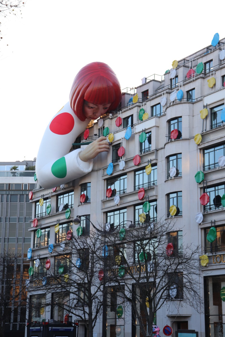 Depuis le 5 Janvier, si vous vous baladez sur la célèbre avenue des Champs-Elysées, vous apercevrez une étrange mise en scène qui ne laisse pas de place à l’indifférence… En effet,l’artiste conceptuelle japonaise Yayoi Kusama signe pour la seconde fois une collaboration de grande ampleur avec la marque de luxe Louis Vuitton.